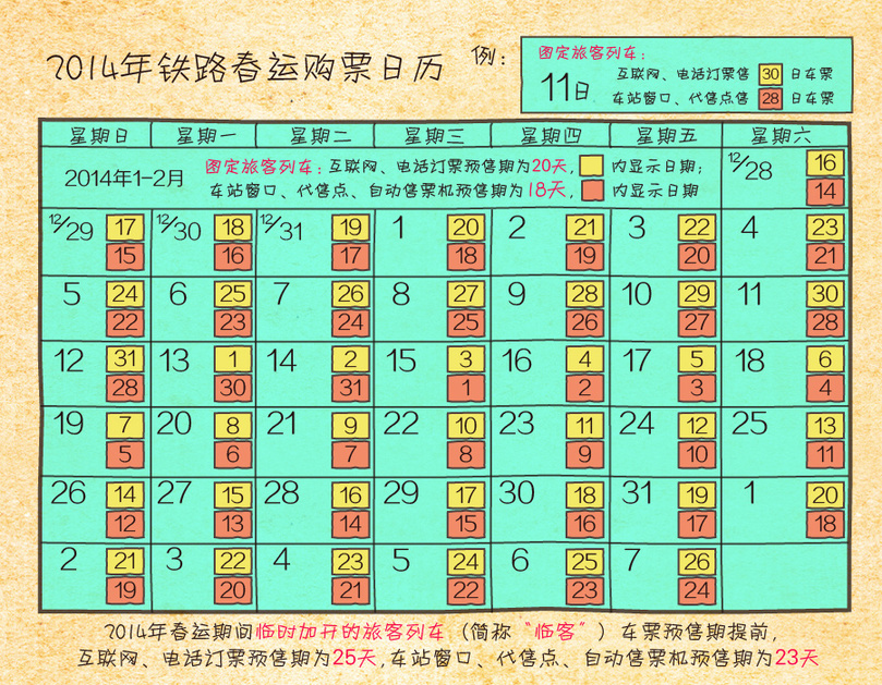 北斗制冷了解到,2014年春运为期40天,从2014年1月16日开始到2月24日结束。通过互联网、电话预订的旅客,预售期达到20天,在车站窗口以及代售点、自动售票机预售期为18天,预计除夕的火车票于2014年1月11日就可以买到。